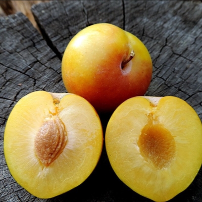 Саженцы сливы Байрон Голд – высокоурожайный и транспортабельный сорт со светло-желтыми плодами и очень вкусной мякотью. Он обладает высокой устойчивостью к болезням и вредителям. Плоды имеют округлую форму и золотисто-желтую окраску. Вес каждого плода составляет примерно 80-100 граммов. Кожица покрыта восковым налетом, что придает ей особый блеск. Мякоть данного сорта очень плотная, немного хрустящая и в меру сочная, отличного сладкого вкуса. Цвет мякоти оранжево-желтый. Размер косточки средний, отделение от мякоти хорошее. Срок созревания – сентябрь месяц.